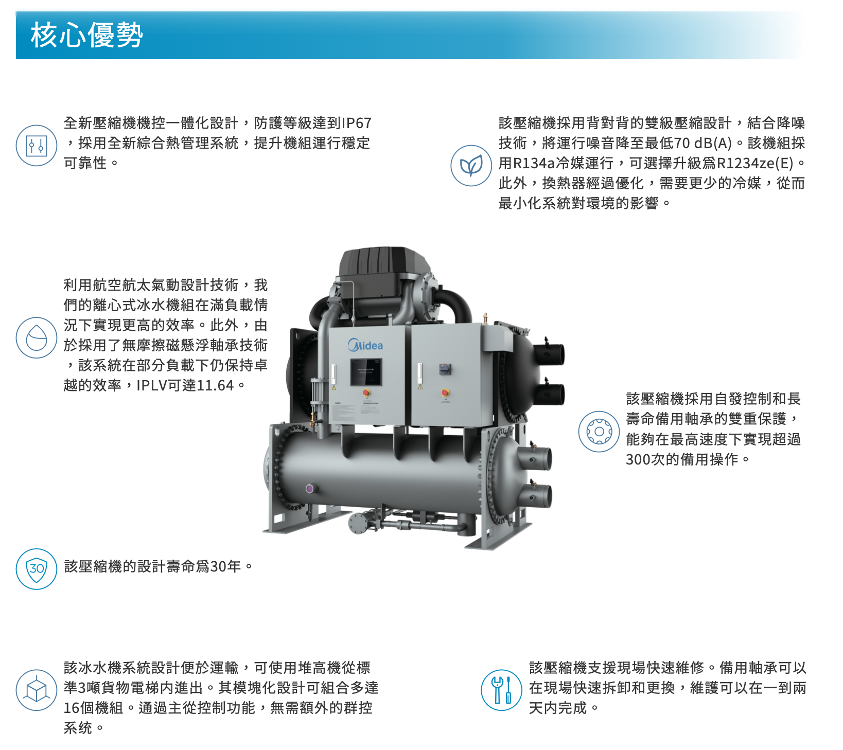 | 超高能效 | COP 6.4+ / IPLV 10.7+ (AHRI認證) | ESG 加分:全降膜蒸發技術,大幅降低碳排與電費。 |