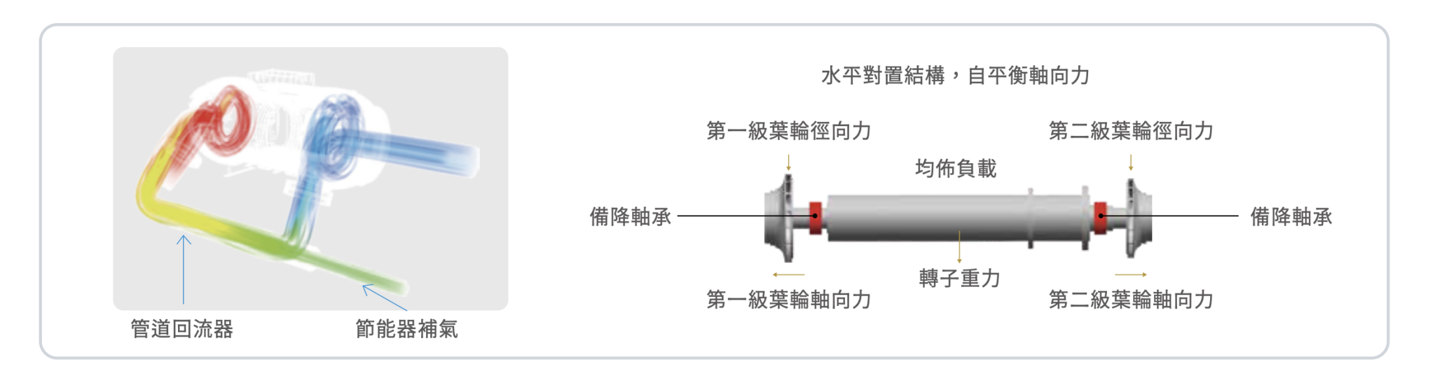業界首創水平對置壓縮,軸向力降低 90% 。